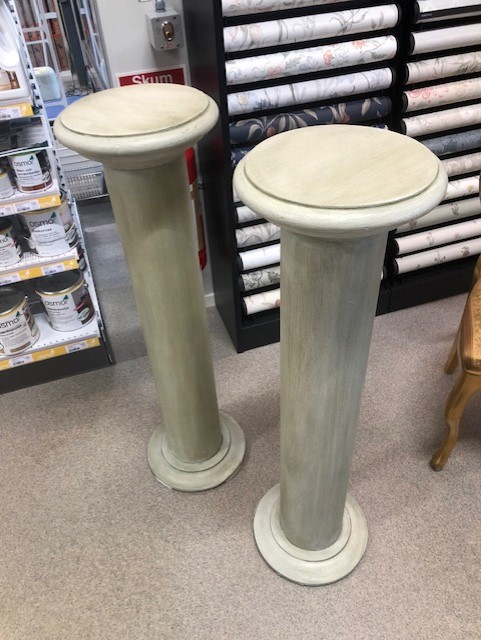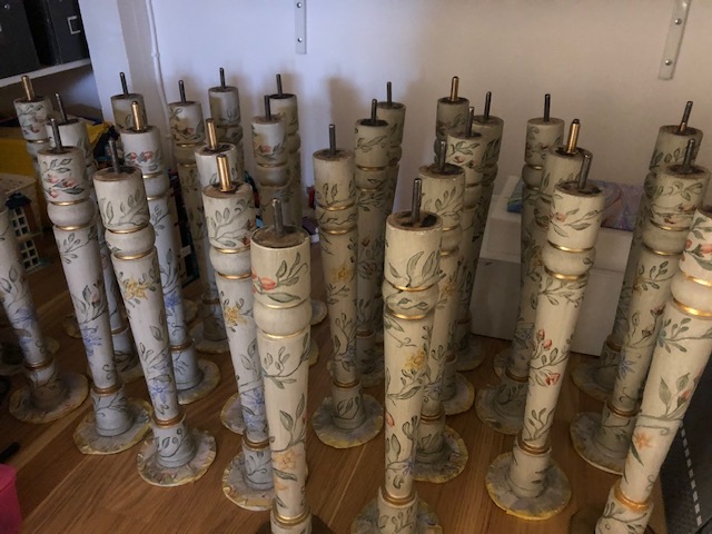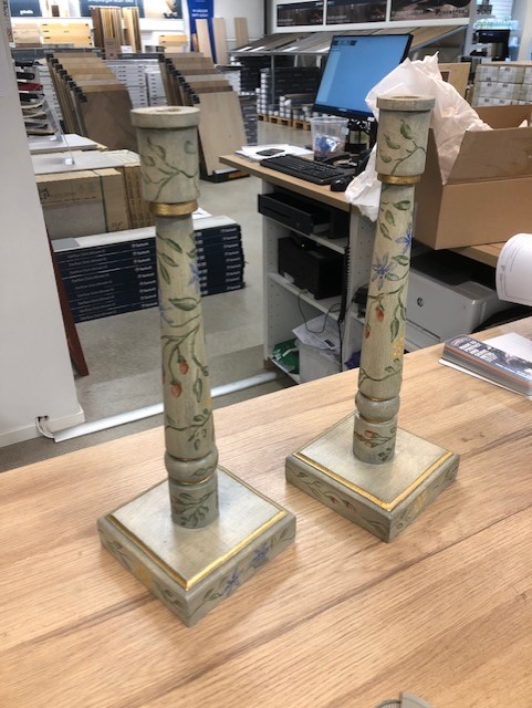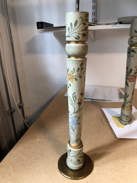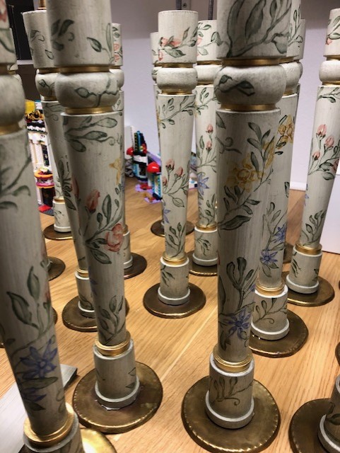 20-tal ljushållare som ådrats samt dekorationsmålats med en blomster-fläta. Piedestaler som ådrats.