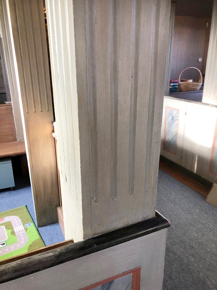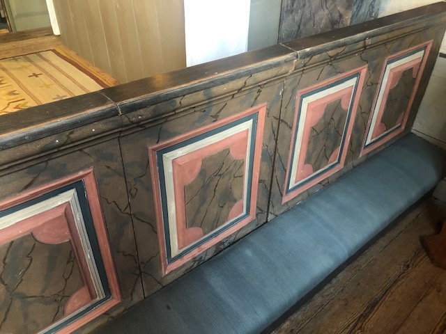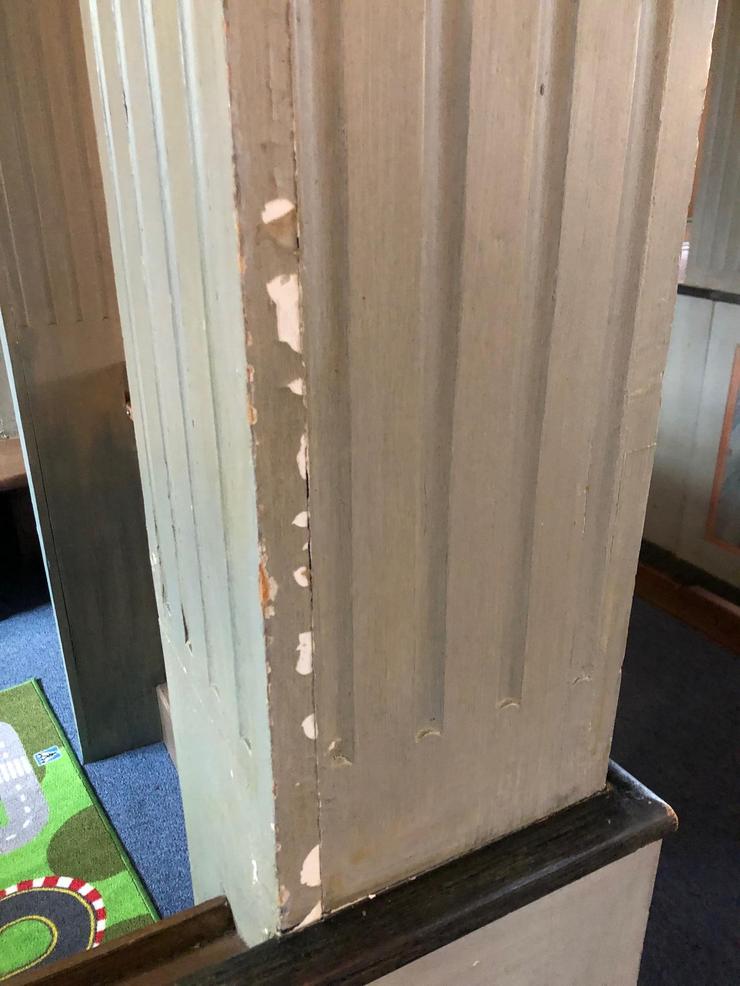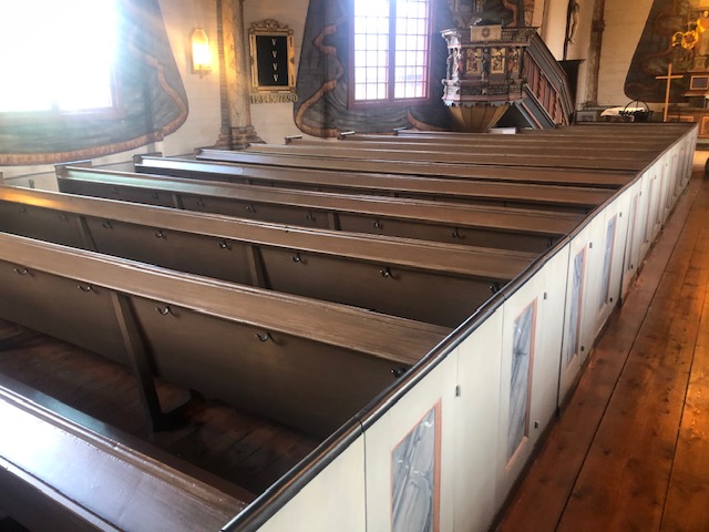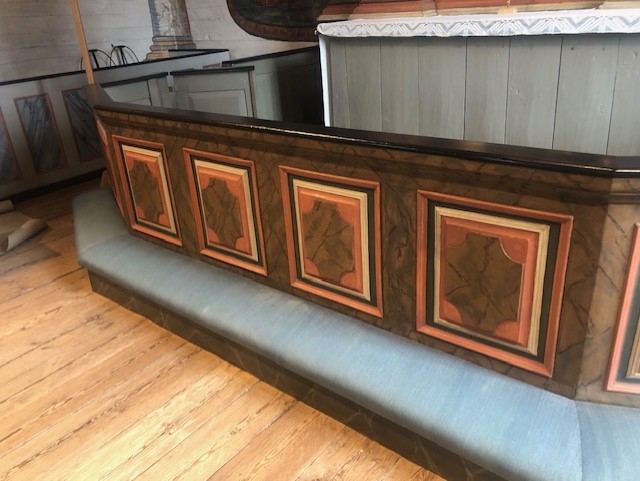 Retuschering av skadade ytor på pelare, altarring och gång.