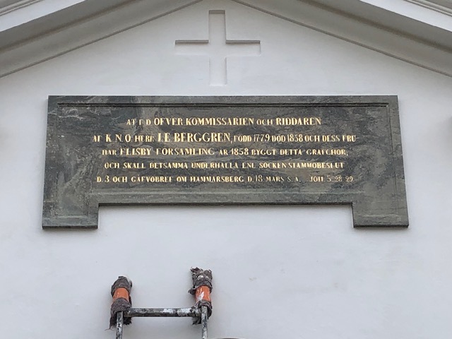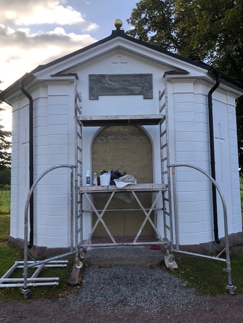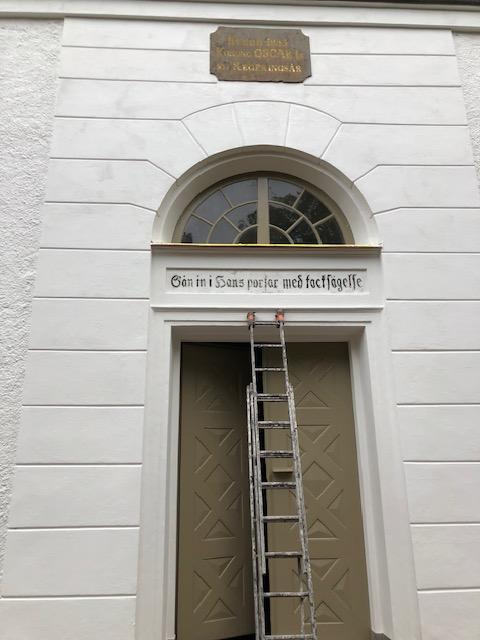 Ommålning av text över port, förgyllning av tavla på kapell samt förgyllning av tavla på tornet. Bilder visar "före och efter".